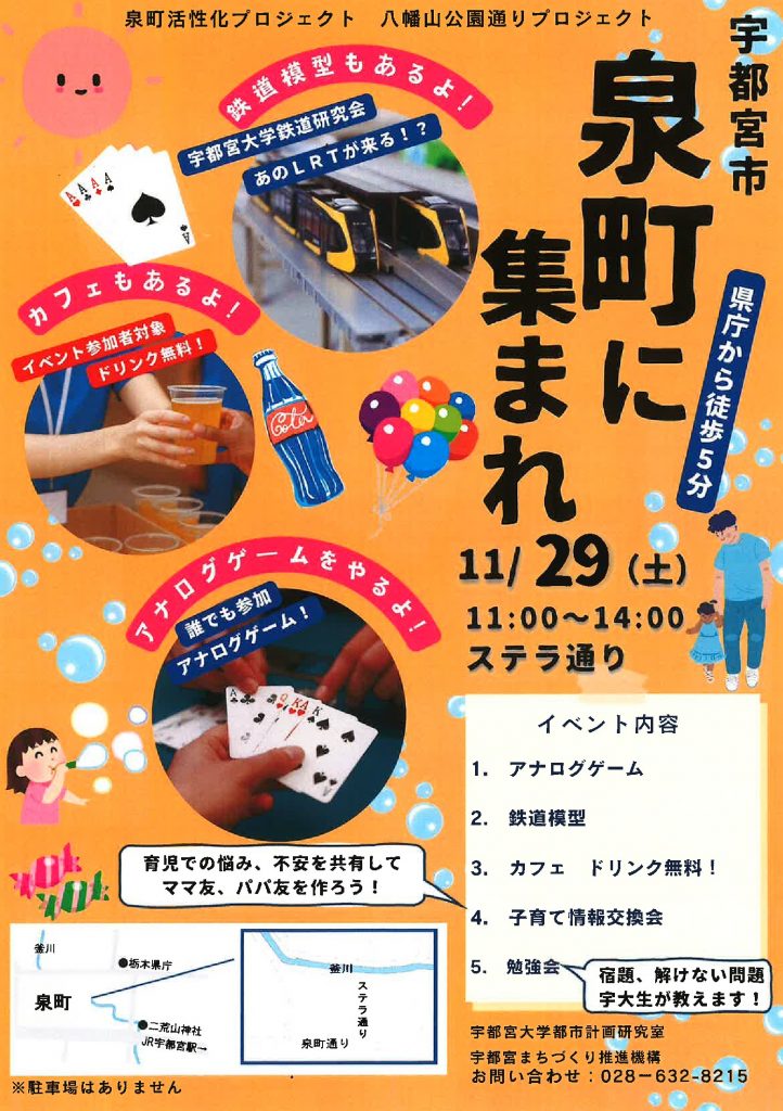 当日は、宇都宮大学生によるゲーム大会、鉄道模型、子育て情報交換会や勉強会など 楽しめる、ためになる催しがあります。ご家族連れ、お友達同士などでご参加ください。どうぞ、昼の宇都宮の泉町をご散策ください!